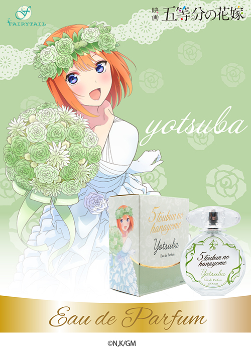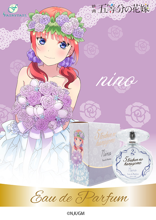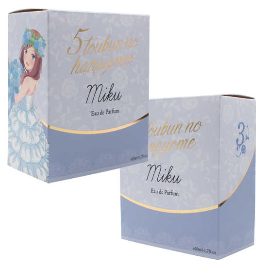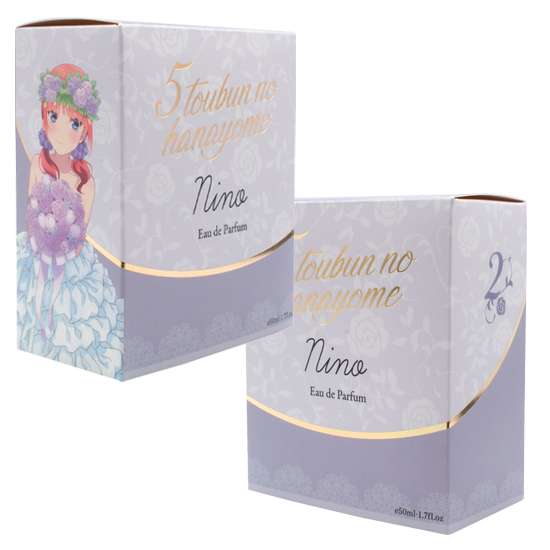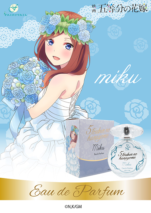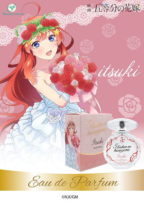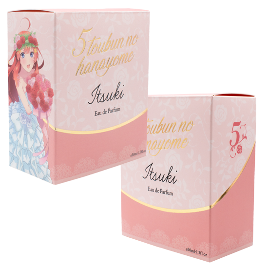 ツンデレで誰よりも姉妹想いな二乃をイメージした香りは官能的なフルーティーフローラルがやさしく包み込み、コンテンポラリーなフレグランスからラストはバニラとホワイトムスクが溶けあう香りです。
